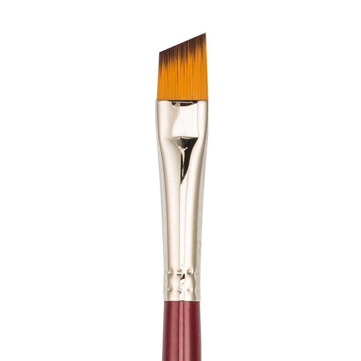 <strong>280 Serisi Sentetik Yan Kesik Fırça</strong><br />Numara: 3/8 (0.95 cm)<br />Kaliteli golden with brown tip(altın renkli, kahverenkli uçlu) sentetik kıldan üretilmiştir.<br />Yağlı boya, akrilik boya, suluboya, guaj boya, kumaş boyası, cam boyası, porselen boyası, dekorative boyama ve maket boyama için idealdir.<br />Yan kesik ucu sayesinde uzun ince çizgiler çekebilmesini sağlar.<br />Hobi çalışmaları ve one stroke çalışmaları için idealdir.<br />Kısa saplı olması daha fazla kontrol olanağı sağlatır.<br />Fırça kılı ile vernikli bordo ahşap sapı birleştiren kısım nikel kaplamalı prinçten yapılmıştır.